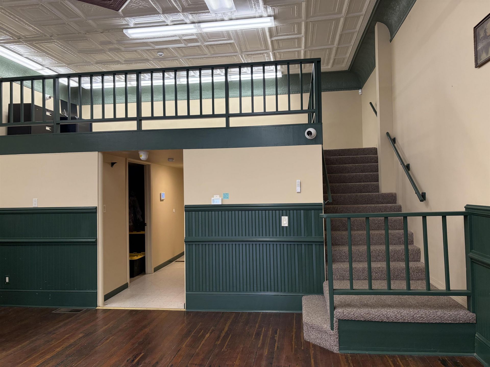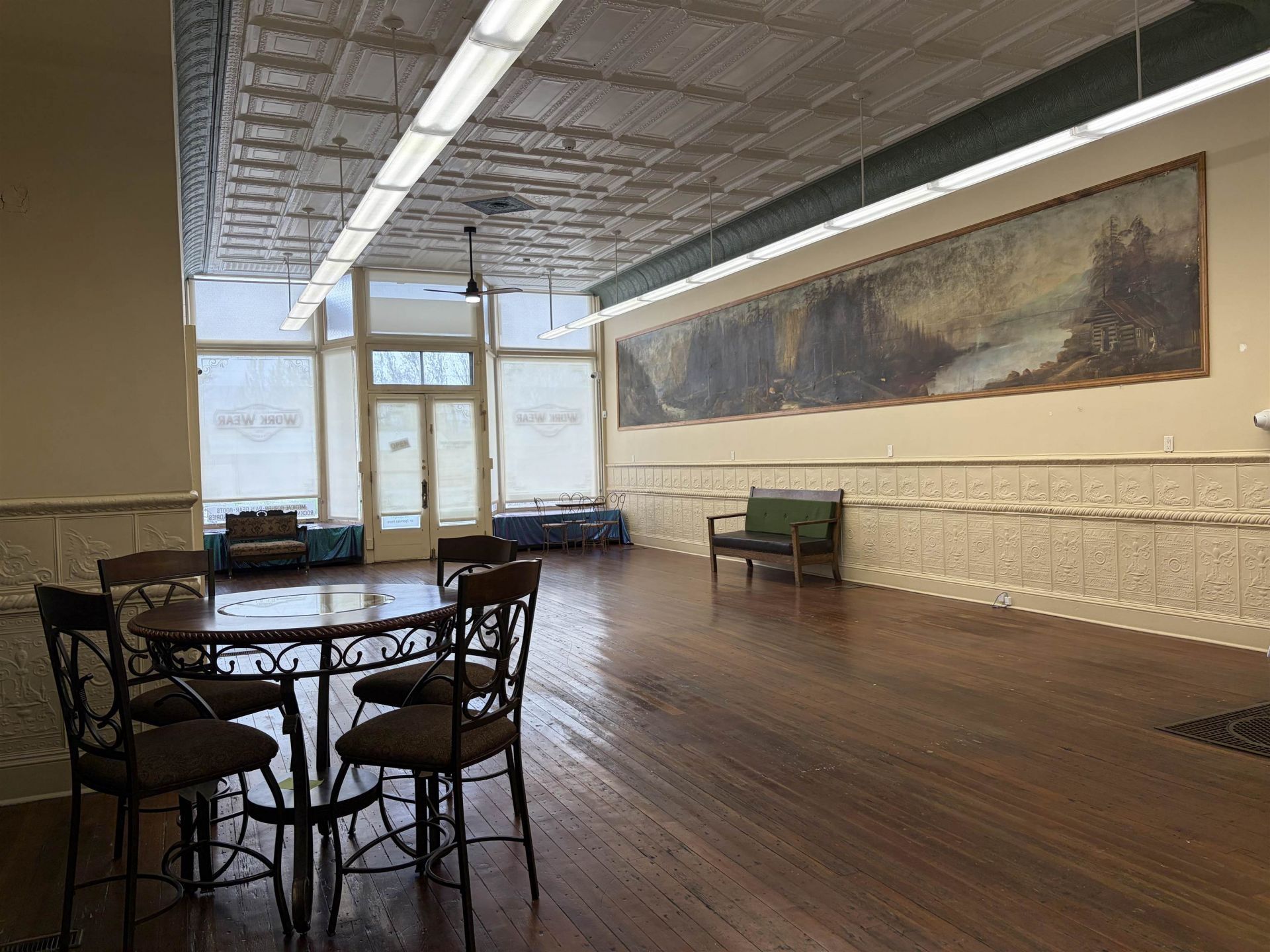 Spacious and flexible commercial unit in the heart of downtown Hotchkiss, situated in a high-traffic location with excellent visibility. Unit 1 offers a ground-floor layout complemented by an open mezzanine overlooking the main level, creating a bright, dynamic environment suited for retail, office, or creative use. The space features updated plumbing and electrical systems, new LED lighting, and beautifully restored original wood floors (1995), along with original tin ceilings and wall panels in excellent condition. The property also includes access to a full basement, ideal for additional storage, as well as an ADA-compliant bathroom and a large storage room. A janitorial room is stubbed out for the potential addition of a second (non-ADA) restroom. The association covers both units, with owners sharing the cost of building insurance and any exterior repairs. The property is equipped with an alarm and fire system featuring remote arm/disarm capability; buyers may opt to continue monitoring services at an estimated cost of $370 per year. Adding to its unique character, the space features a historic wall mural painted by Alva Browning in the 1920s, offering notable local historical significance. Blending functionality with historic charm, this distinctive unit is well-suited for a wide range of business opportunities.